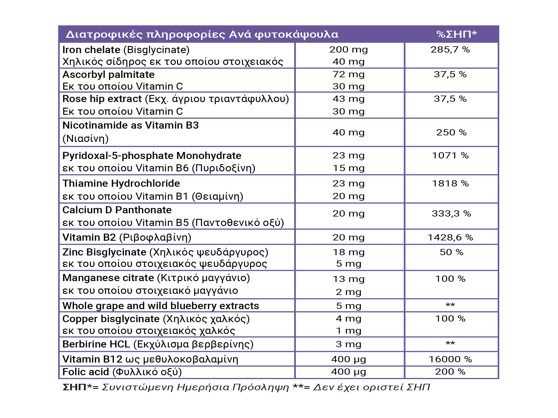 ΣΗΠ* = Συνιστώμενη Ημερήσια Πρόσληψη **= Δεν έχει οριστεί ΣΗΠ