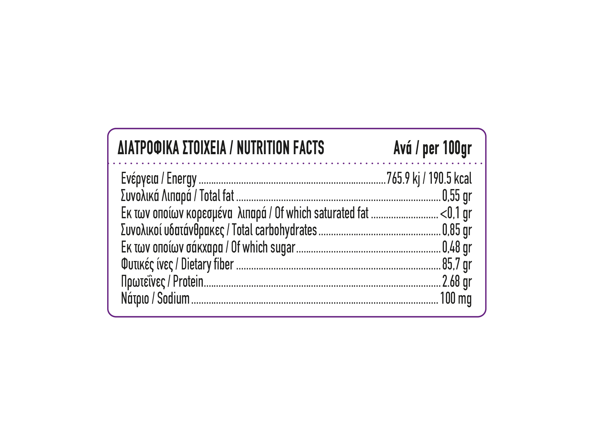 Προτεινόμενη χρήση: Αναμείξτε 1 γεμάτο κουτάλι της σούπας (~6γρ.) σε 200-250ml νερό, χυμό ή smoothie, ανακατέψτε καλά και καταναλώστε. Κατά προτίμηση συνοδεύστε με ένα ακόμη ποτήρι νερό. Μπορεί να χρησιμοποιηθεί έως και 2 φορές/ημέρα, ανάλογα με τη συνολική πρόσληψη φυτικών ινών.